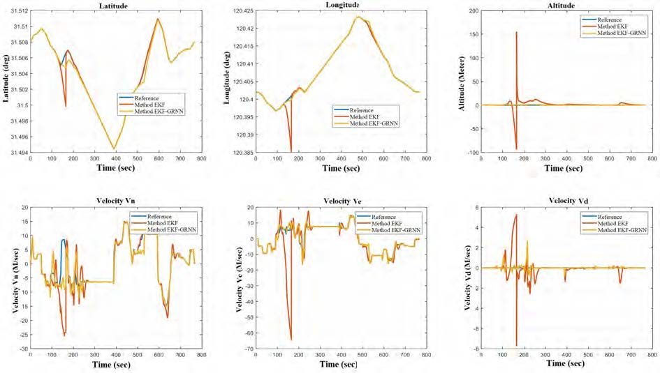 GRNN has not been previously applied in this area, although neural networks in general have been actively used. For example, in [7] the authors applied a stable extended Kalman filter (SEKF) to overcome the low accuracy of the GPS/INS algorithm during GPS outages. They developed a low-cost method for GPS/INS integration and compensation of algorithm errors in the absence of GPS signals. Their approach compensated for the impact of gross errors in INS observations by using an artificial neural network-based integration method to fill in missing position information. A well-trained neural network predicted and compensated for errors in interrupted position signals. The effectiveness of the proposed method was assessed in field tests using specially developed equipment, GPS and INS sensors. The results showed a 67% improvement in positioning accuracy for each axis in the outage periods. The proposed algorithm is capable of improving the accuracy of the integrated GPS/INS system to meet navigation requirements.
