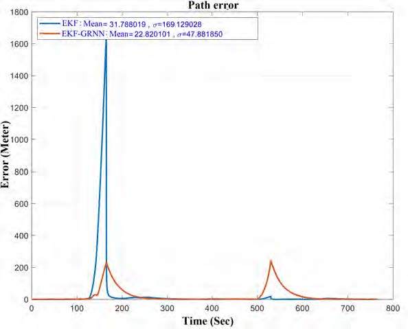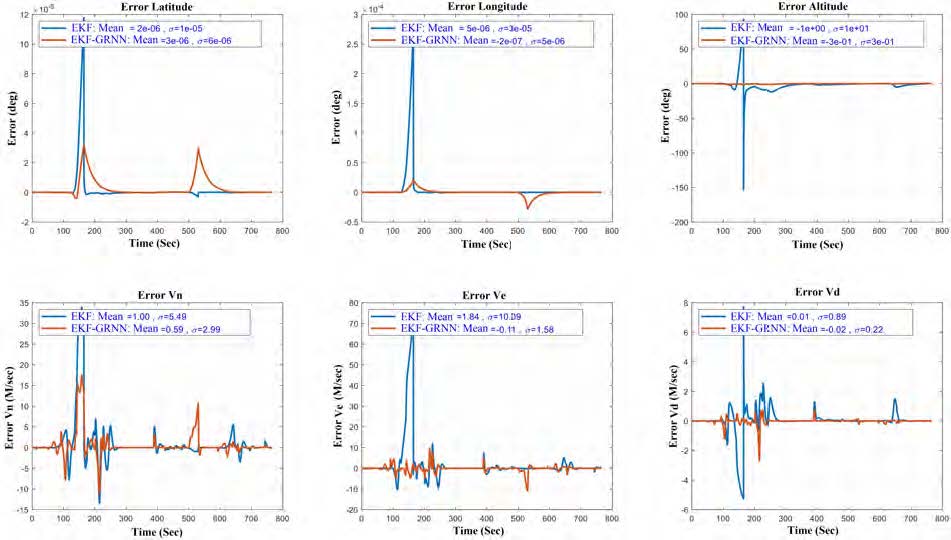 Taking advantage of the GRNN training procedure allows to determine the optimal value of the parameter s. The best practice is to find the value at which the mean square error (MSE) is minimal. Training is performed using the input data to find s corresponding to the minimum MSE value. The results show that the GRNN-EKF method is superior to the method using only EKF, and the accuracy of determining navigation parameters is significantly improved. This performance improvement is due to the main advantages of the estimation performed by GRNN, which are always able to converge to a global solution and do not get stuck in a local minimum, unlike standard feedforward networks trained using backpropagation.