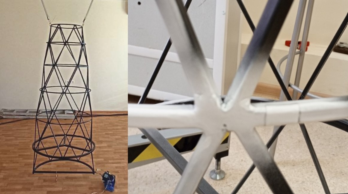 The object of the study is a model of the telescope frame of the remote sensing spacecraft (RS SC) and is a truss structure (Fig. 1). To conduct the tests, the structure was suspended on springs with stiffnesses of 770 and 730 N/m. The disturbance was applied using a vibration pulsator with a built-in force sensor that made it possible to obtain data on the magnitude of the disturbance. The structure was loaded in a random direction using random “white” noise.