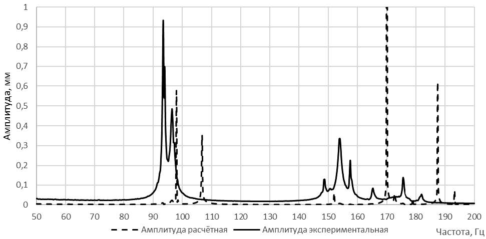 Analysis of the obtained data shows that the results of the calculation model do not correspond to the dynamics of the structure along the Y axis to a greater extent than along other axes. In the region of natural frequencies, the calculation model gives a complete discrepancy with the experiment, and in the frequency range from 100 to 145 Hz it most corresponds to the behavior of the loaded structure along the Z and X axes.