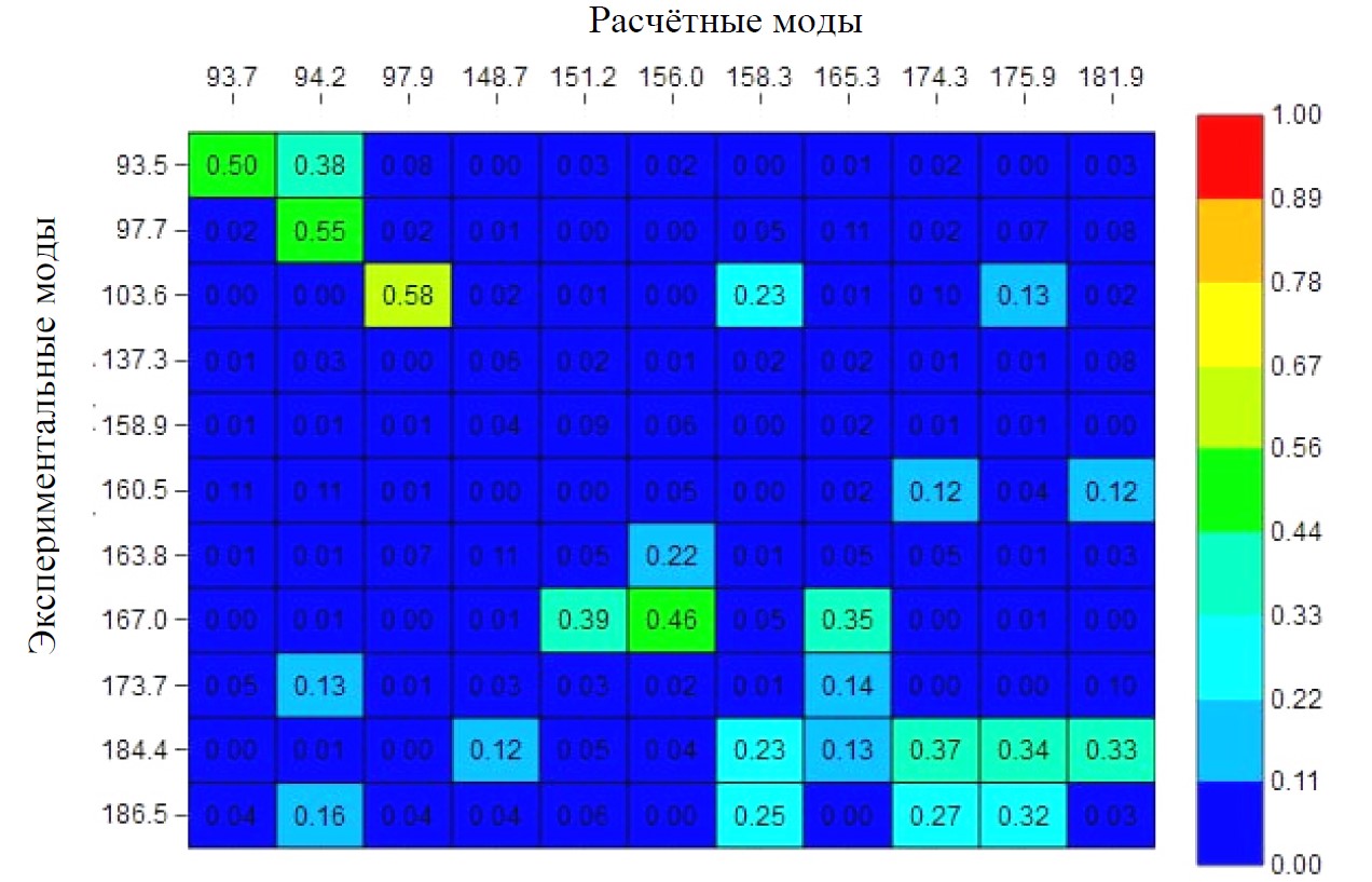 The results of calculations and vibration tests showed that the first and second natural frequencies of the calculation model are close to the experimental values of the vibration frequencies of the first and second tones of the telescope frame model. Fig. 4 demonstrates the values of the MAC criterion while obtaining vibration modes from FRF based on vibration displacements. The analysis of the obtained data reveals poor correspondence between the calculated and experimental vibration modes and the need to correct the finite element model, as well as an insignificant difference in the calculated criteria from the transformation of experimental data into different units of measurement.