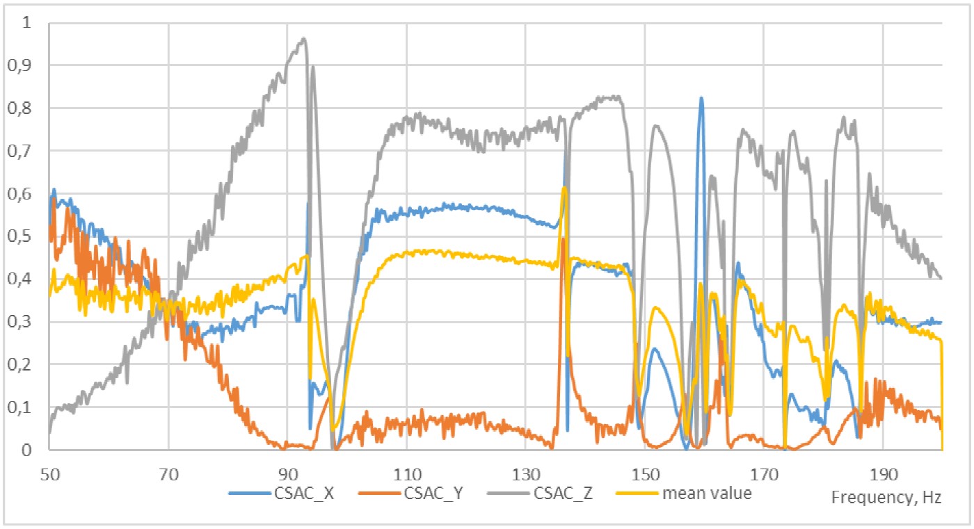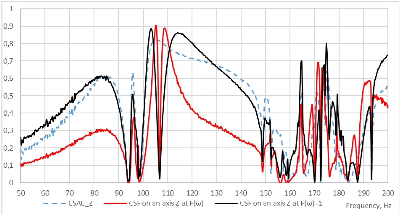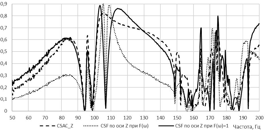 Рис. 6. Результаты расчёта критерия CSAC для оси Z; CSF при нагрузке в виде зависимости силы от частоты F(ω), соответствующей экспериментальным данным; CSF при нагрузке в виде единичной силы в рассматриваемом диапазоне частот
