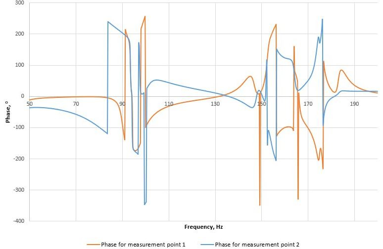 The study of the dynamic characteristics of the telescope frame model design was performed using a three-component laser scanning vibrometer Polytec PSV 400-3D. The expected locations of the laser beam impact were painted white. Since the design of the model has got a complex spatial shape (Fig. 1), obtaining dynamic characteristics is possible only for 1/4 of the design in one measurement without moving the measuring devices of the laser vibrometer. Conducting subsequent experimental studies while moving the measuring devices allows to obtain dynamic characteristics measured for points in the rest of the structure. Initial analysis showed that the “junction” points of the experimental grids of the structure may be in different phases (Fig. 2). This feature is assumed to be associated precisely with the type of the disturbance function, since due to “white noise” type of disturbance, the phase value is random. The solution of this problem is not intended within the scope of this article.