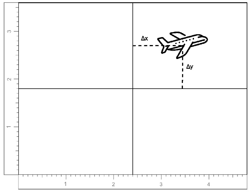 Now we need to move from a linear representation in pixels to an angular representation in degrees or radians. To do this, we divide the frame into quadrants. We will take the axes denoting the width and height of the frame to be equal to one angle of the solution horizontally and vertically, respectively. Consequently, points along these axes will have coordinates in the range from –0.5 to +0.5. Therefore, we eliminate the need to know the resolution of the original video to calculate the pixel value in angular measure. The coefficients of linear displacement of the target relative to the frame center can be calculated using the following formula:
