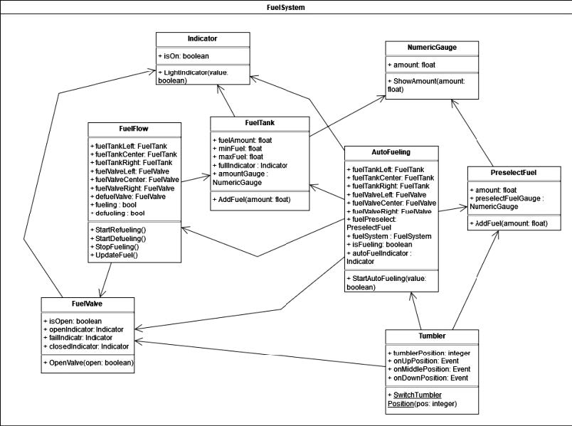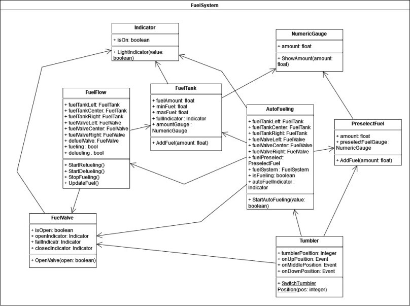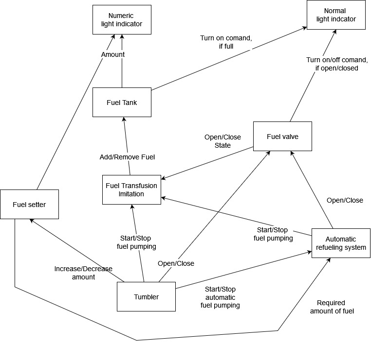 - FuelSystem is a facade class [14], which refers to the other classes of the fuel supply system and the refueling console and is used to manage and retrieve data about the current state of the refueling system from a single interface. This object is designed to simplify access of any other program components to the data and the function of simulating the console and fuel system.