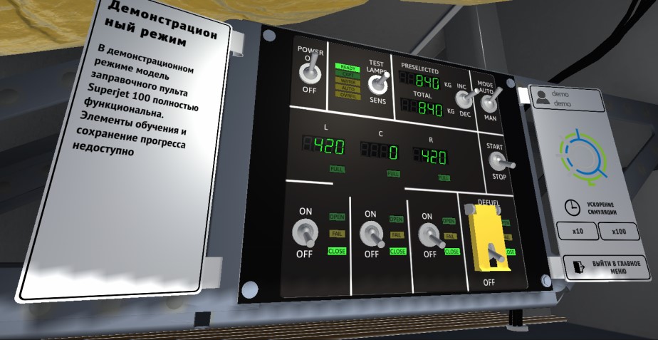 Currently, the presented simulation model is used in the simulator "Control and management console for refueling Sukhoi Superjet 100" [16]. This program contains software components for performing two types of tasks: studying the elements of the refueling console and algorithms for working with the control and management console for refueling. Each type of task contains a training and testing mode.