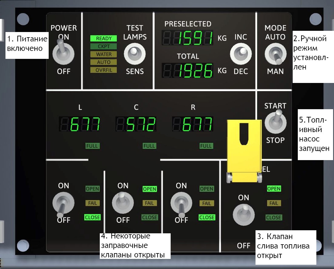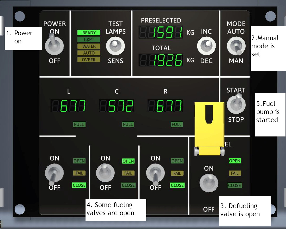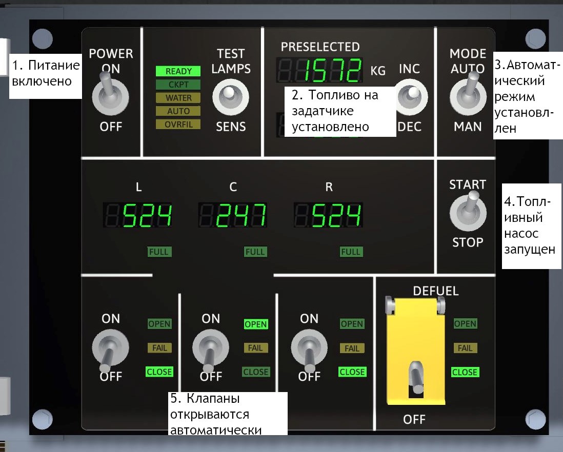 - PreselectFuel is an object for controlling the required fuel quantity setter. It stores the required fuel quantity and changes this quantity when moving the three-position switch. The required fuel quantity is displayed on the numerical indicator on the remote control;