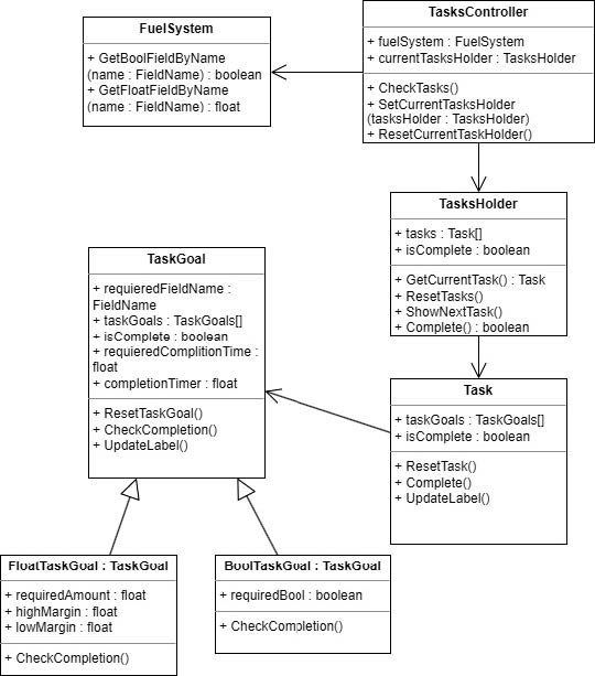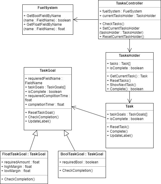 - TaskGoal is a subtask class that contains the name of one of the variables of the fuel system simulation of the FieldName enumeration type and its required value. To separate the logic of working with different variables from this class, two others are produced: BoolTaskGoal for logical variables and FloatTaskGoal for numeric variables. Objects of this class receive the current value of the fueling system variable through the GetBoolFieldByName functions for logical variables and GetFloatByFieldByName for real variables from the FuelSystem object. Then the subtask is marked as completed if the required value of the variable is achieved inside the fuel system and remains so for a certain period of time.