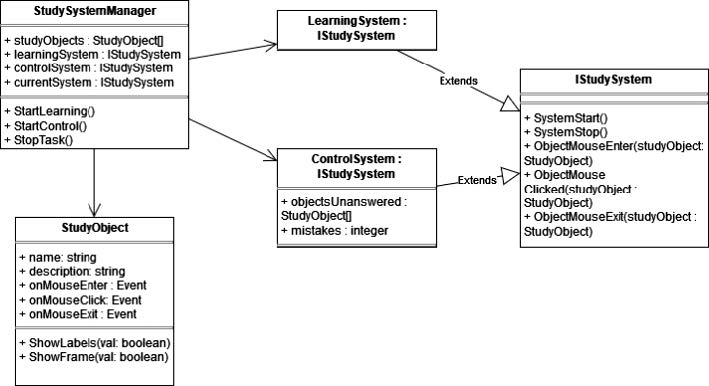 The first type of task is used to study the elements of the control panel and their location. In the training mode of this task, the user can click on each of the elements of the control panel to get its description. In the test mode, on the contrary, the user is given a description of the element that must be found on the control panel. The study of the elements of the gas station control panel is carried out using the StudySystemManager study module (Fig. 9). This class tracks the user's interaction with StduyObject objects, which are attached to the corresponding elements of the three-dimensional model of the gas station control panel. Processing of user interactions with these objects is delegated to two implementations of the IStudySystem class: one for the training mode, the other for the test mode.