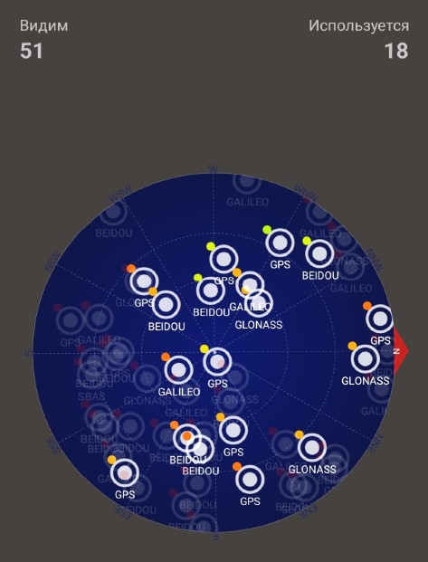 Рис. 1. Видимость спутников GPS, GLONASS, BEIDOU, GALILEO