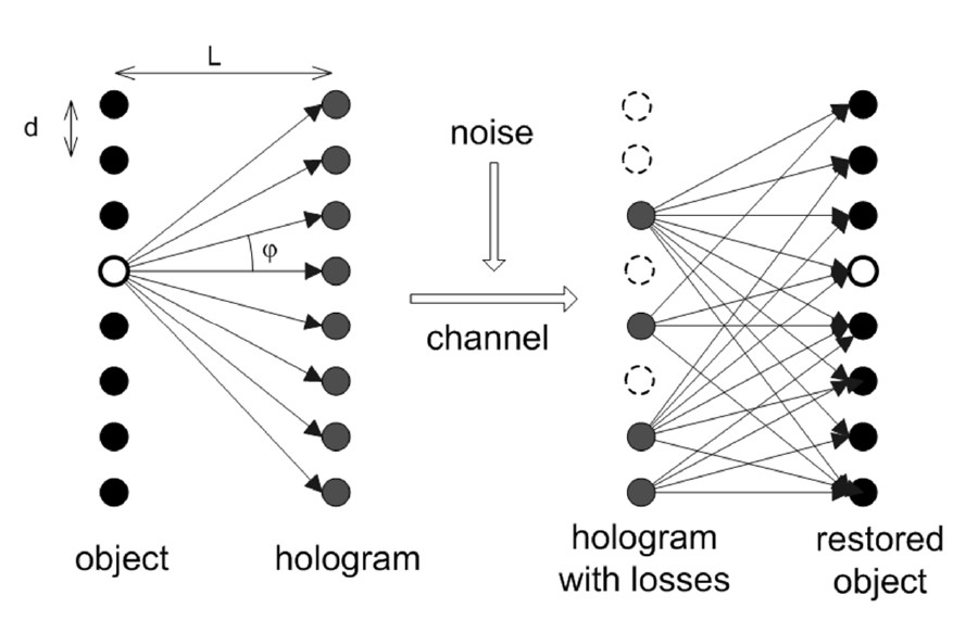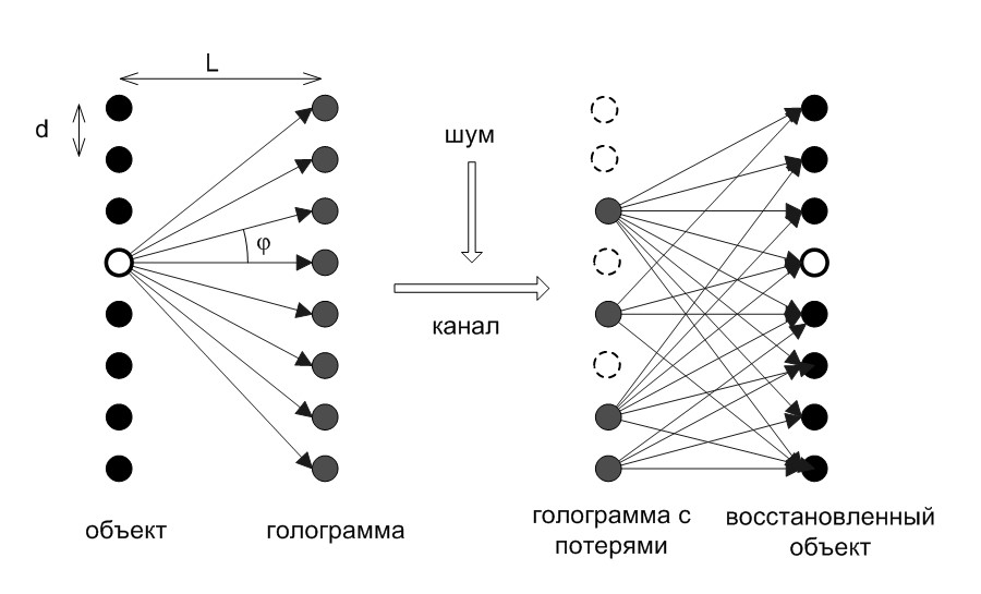 Принятая по каналу связи искаженная голограмма HR(j) рассматривается как одномерный массив точек, число которых может быть меньше N вследствие потери части информации, а значения принятых элементов искажены шумом. Каждая из точек голограммы HR(j) является источником сферической волны с той же длиной волны λ, как и при кодировании. Восстанавливаемый объект AR(i) представляет собой одномерный массив точек, расположенных с шагом d на прямой, параллельной голограмме HR(j) и расположенной на расстоянии L от нее.