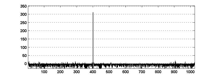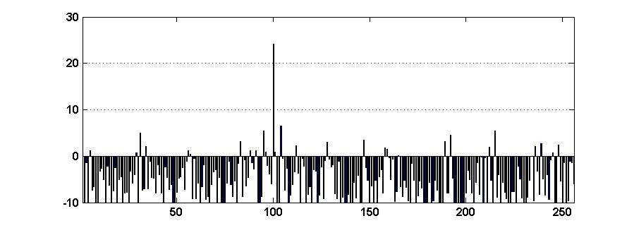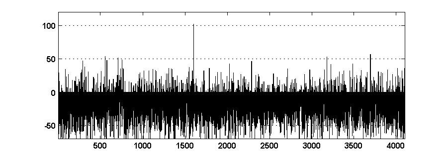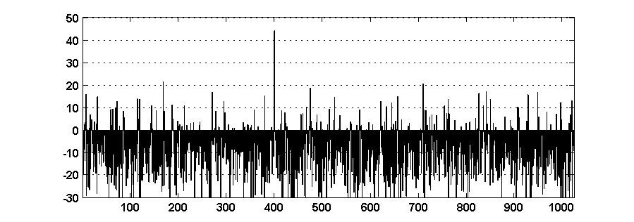 Увеличение длины кодовой комбинации приводит к возрастанию помехоустойчивости кода. При N = 1024 выходной сигнал восстанавливается из сигнала, на 80 % состоящего из случайной последовательности. Отношение сигнала к шумовому пику на выходе декодера равно 6,3 дБ (рис. 7).