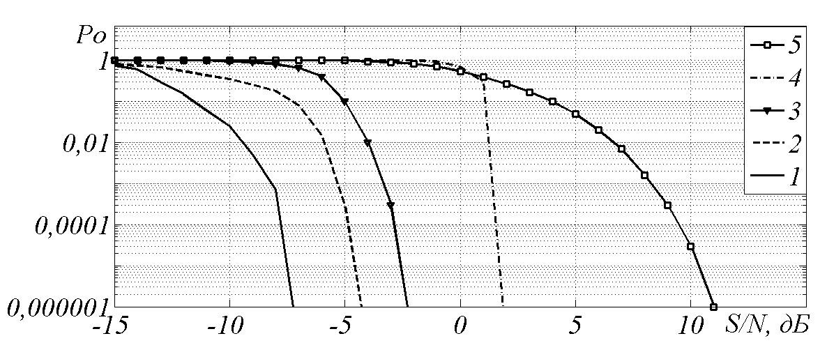 10. Рис. 9. Зависимость вероятности ошибки декодирования PО от отношения сигнал / шум при скорости кода R = 1/32: 1 – голографический код; 2 – мажоритарный код; 3 – РМ-код; 4 – РС-код; 5 – без кодирования