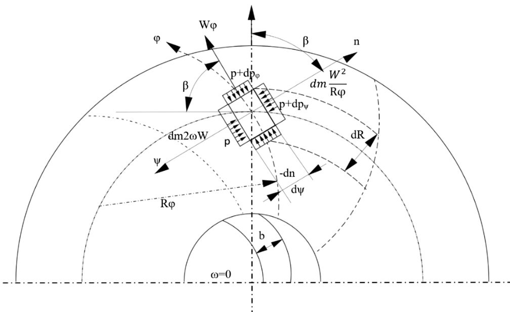The projection of this centrifugal force ,which arises due to the presence of curvature along the flow line, and the Coriolis force on the direction φ will be equal to zero due to the perpendicularity of the relative velocity. Then , is written [22]: