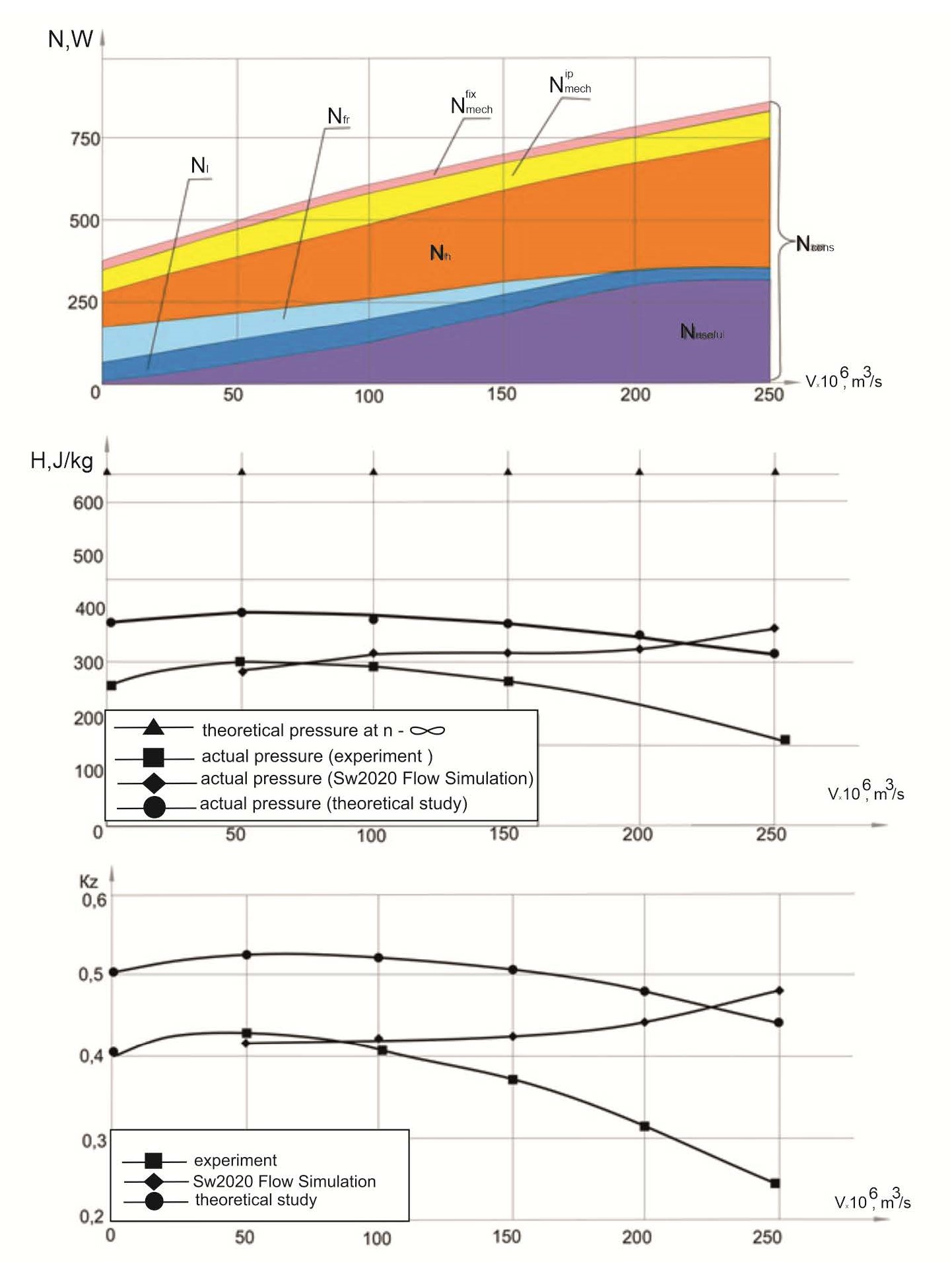- graphs of power balances, the dependence of pressure and Kz on the flow rate of a low-flow centrifugal pump (cylindrical blades, ) and (tangential blades, β2v = 77°) were constructed.