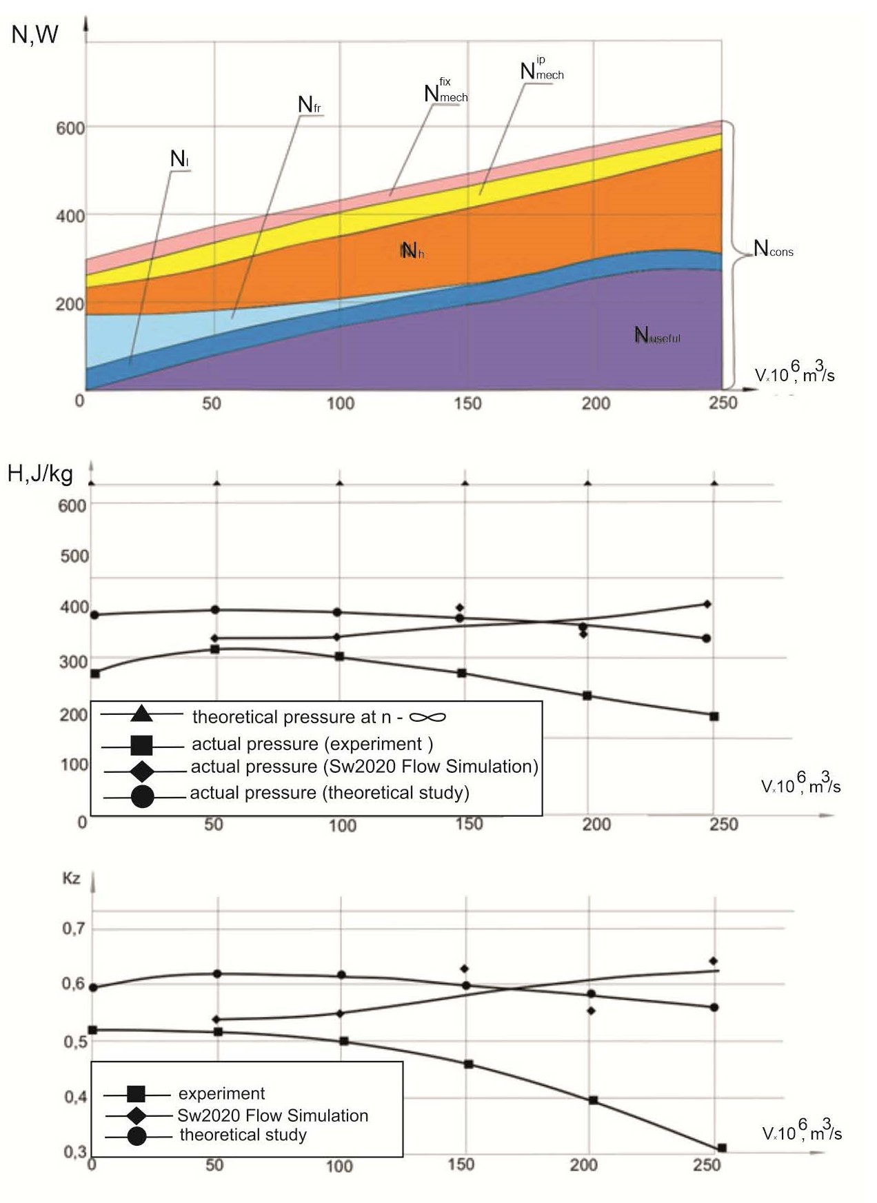 Рис. 3. Баланс мощностей, зависимость напора и Kz от расхода малорасходного центробежного насоса (тангенциальные лопатки, β2v= 77°)