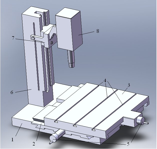 Рис. 1. Внешний вид электроконтактно-химической установки без ванны: 1- основание; 2 – средняя часть основания; 3 – верхняя часть основания; 4 – пазы; 5 – маховики; 6 – стойка; 7 – держатель; 8 – ЛЭДД