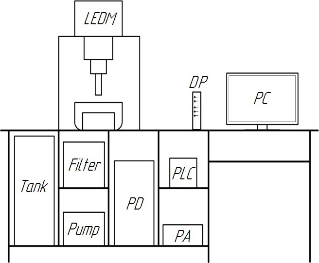 Fig. 2. Layout of elements of the installation for electrocontact chemical processing: LEDM – linear electrodynamic motor; PD – power distributor; PLC – programmable logic controller; PA – power amplifier; DP – display panel; PC – personal computer