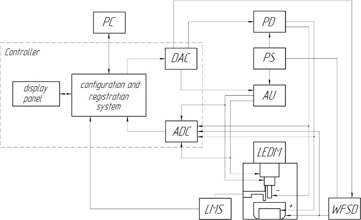 Fig. 3. Block diagram of the control of the ECHO installation: PD – power distributor; PS – power supply; AU – amplifying unit; WFSD – working fluid supply device; PC – personal computer; LMS – linear motion sensor; LEDM – linear electrodynamic motor; DAC – digital to analog converter; ADC – analog to digital converter