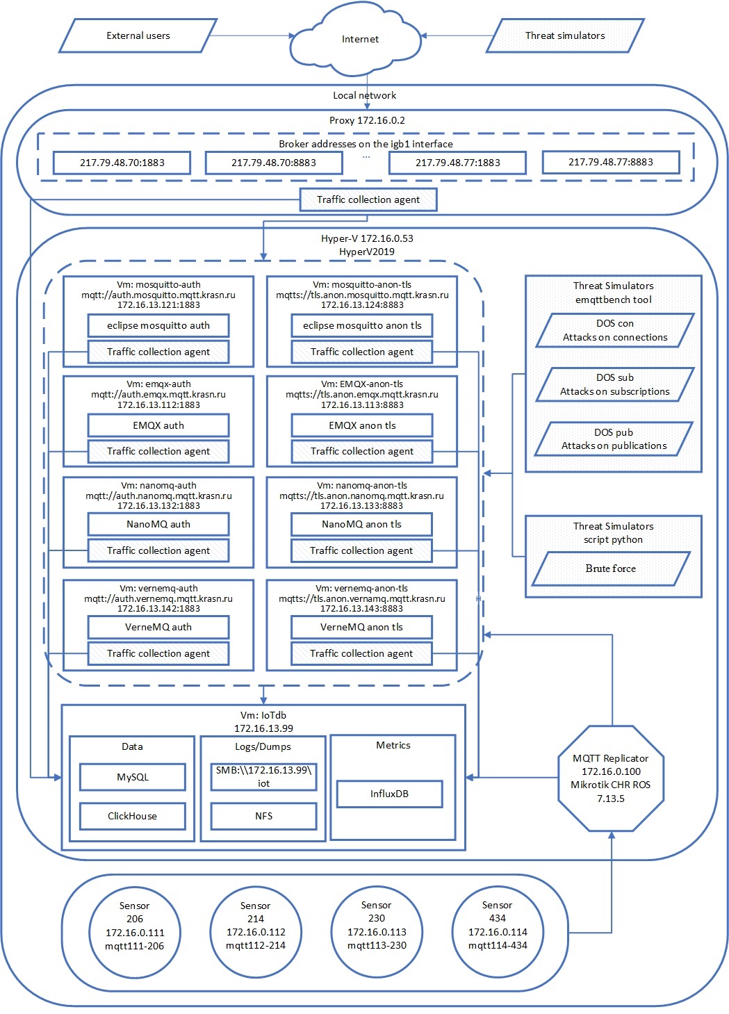 The conceptual diagram of the data collection and security threat simulation infrastructure is shown in Figure 4. The infrastructure includes 16 independent brokers and a replicating broker for distributing data from publishers, as well as software agents that collect information about the interaction of IoT devices with the outside world and within the network.