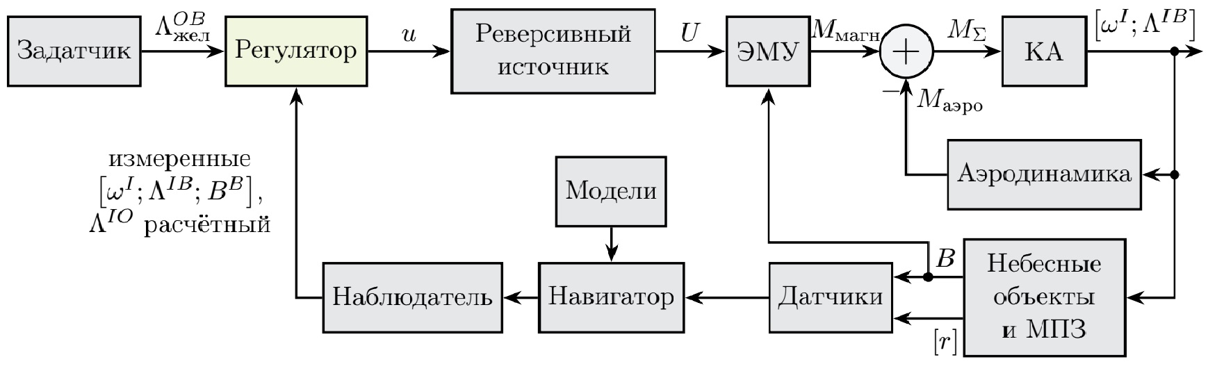 In the structural diagram, it is possible to distinguish groups of blocks that have different natures. For example, spacecraft rotations, aerodynamic and magnetic moments have a physical nature and act continuously; the controller, observer and navigator are algorithms that operate in the onboard computer with some periodicity. It is clear that in simulation modeling, these groups must be calculated using different computational methods, linking them into a single calculation in order to obtain a joint solution.