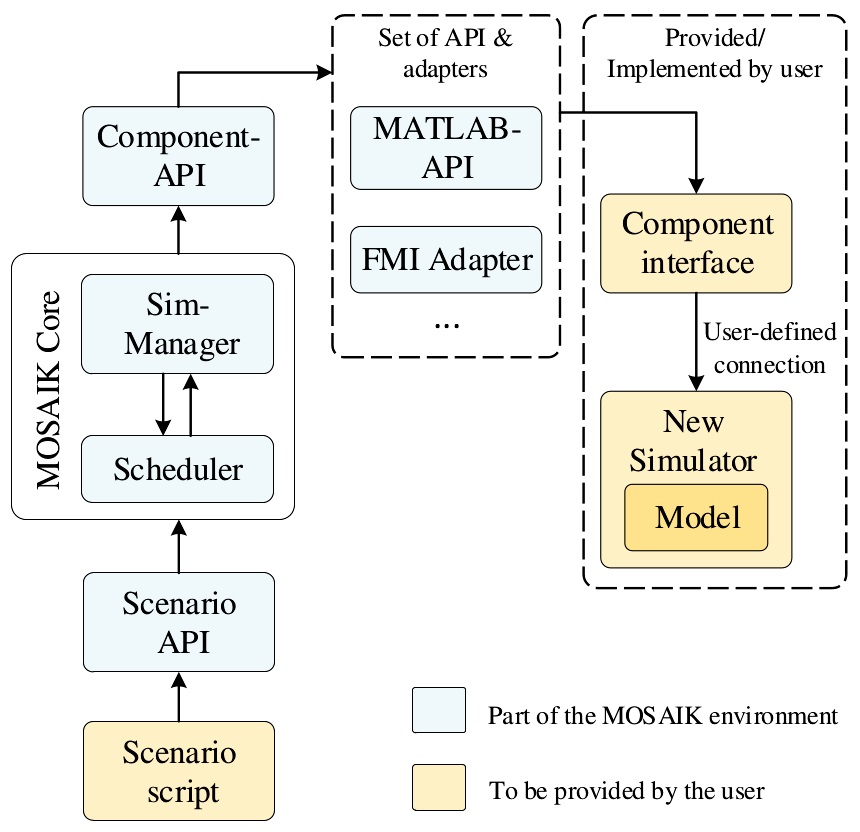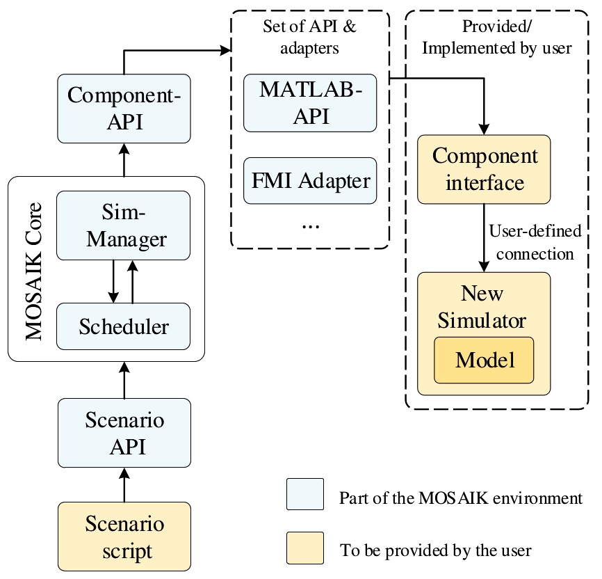 The architecture of the MOSAIC package, written entirely in Python, includes a core and a set of interfaces (Fig. 4). The core, in which the orchestrator is implemented, consists of two components: a scheduler and a model coordinator.