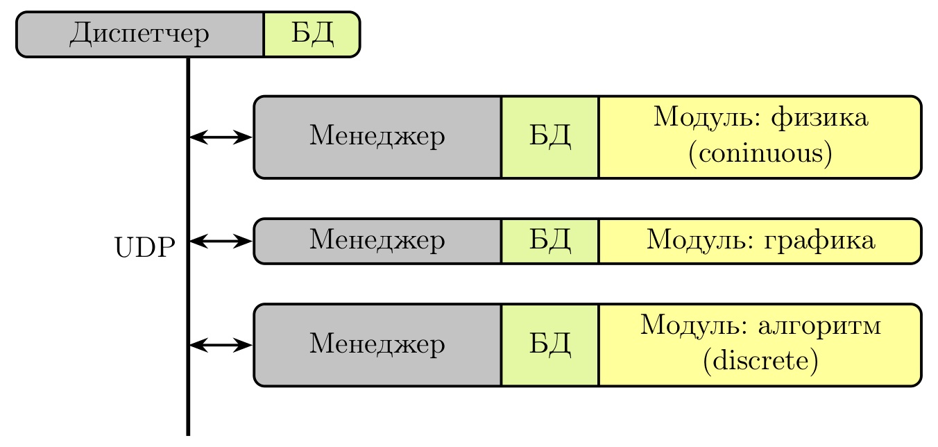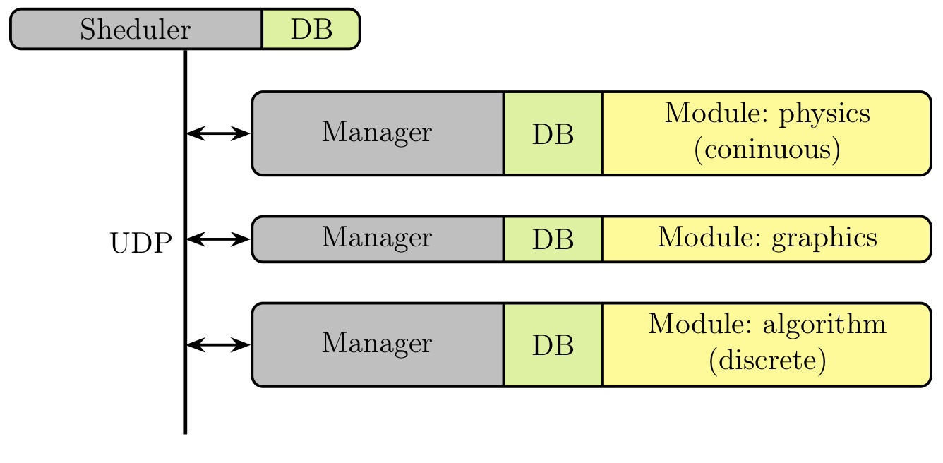 Data exchange is performed via UDP packets, which contain variables from the common database required for a specific module. Each module contains a database manager. It unpacks/packs packets and distributes data according to the internal variables of the module class. The system is based on [13], where exchange is performed with the equipment of the stand, which works like a calculation module.
