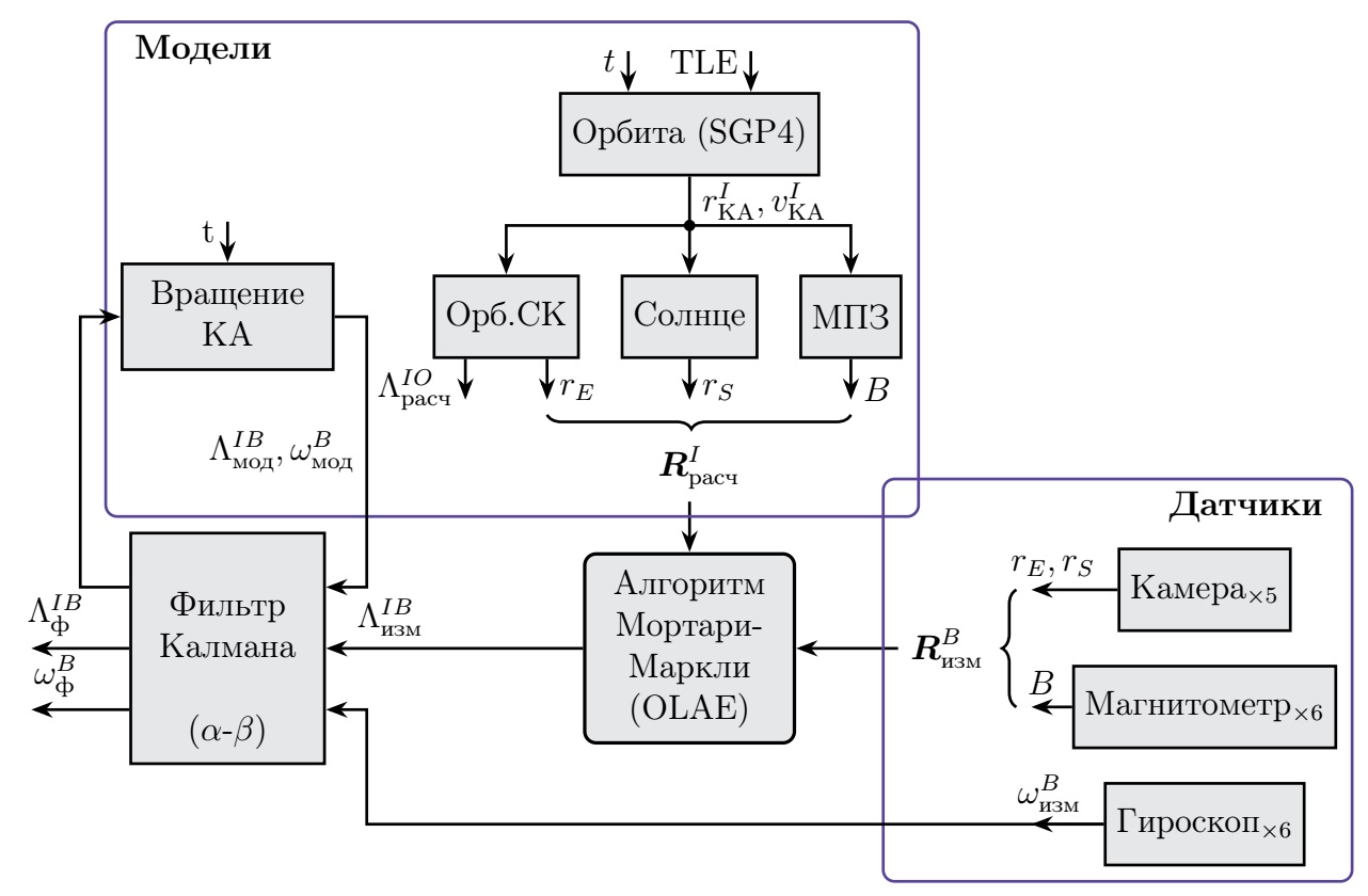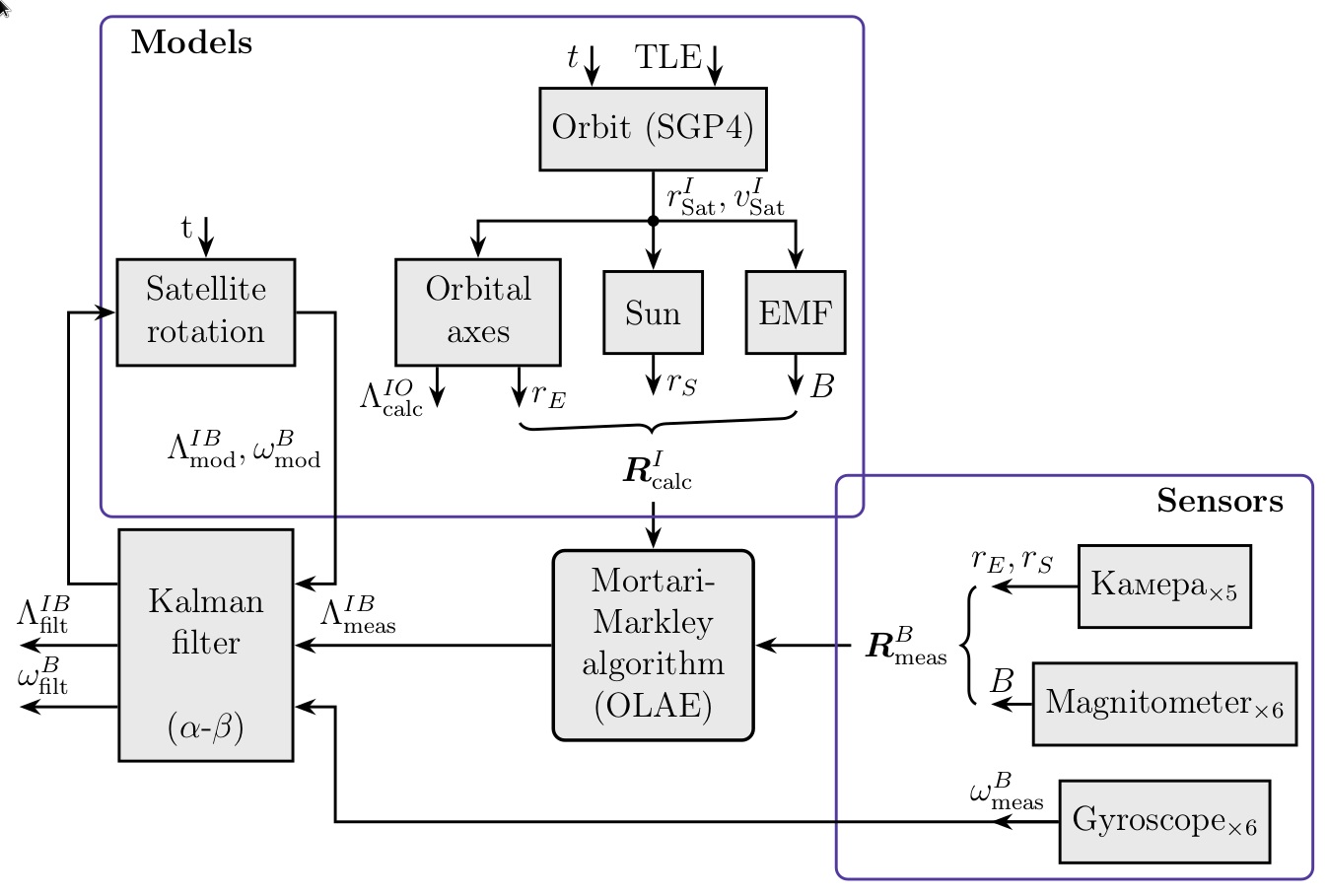 The orientation system model presented in the report [11] is written entirely in Python. Its peculiarity is that it uses a simplified technology of joint modeling: a common matrix of equations is formed, solved by the LSODA algorithm for continuous systems per time step; then the orientation system algorithms are executed. The system has algorithms and equations of individual blocks, each of which ensures the formation of its part of the equation system.