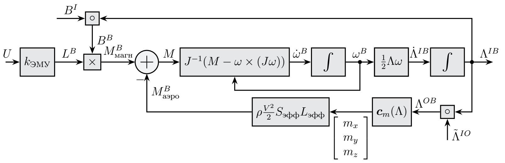 The state of the spacecraft (SC) is described by the angular velocity ωI and the rotation quaternion ΛIB of the associated coordinate system (superscript B, body axes) relative to the inertial space (I, inertial). The state depends on the applied rotational moment, which is composed of the moment from the Maero aerodynamic forces and the magnetic moment Mmagn. The controlling moment is the magnetic moment, which is created by the interaction of the magnetic fields of the electromagnetic device (EMD, magnetic coil) and the vector B of the Earth's magnetic field (EMF).