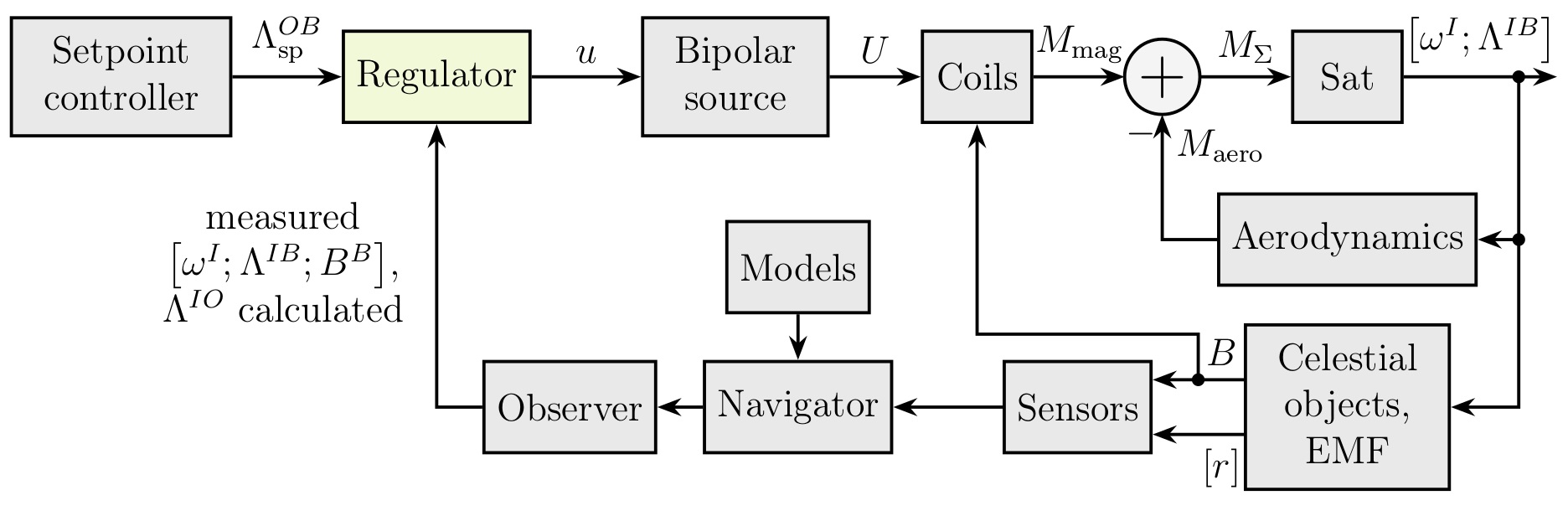 Control with aerodynamic feedback is quite complex. A detailed examination of the control principle in this case requires a separate article. Briefly, it can be noted in advance that the aerodynamic moments have a value of about 10 % of the moments created by the magnetic orientation system. Therefore, in the first approximation, we will not take this feedback into account.