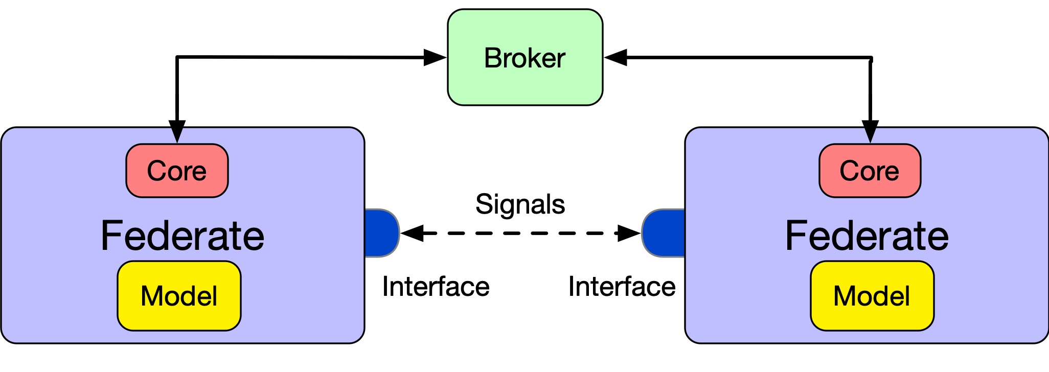 Fig. 3. Base architecture of HELICS framework [5]. Here Federate is a computational module containing a core (simulation control and message interface) and executable model code