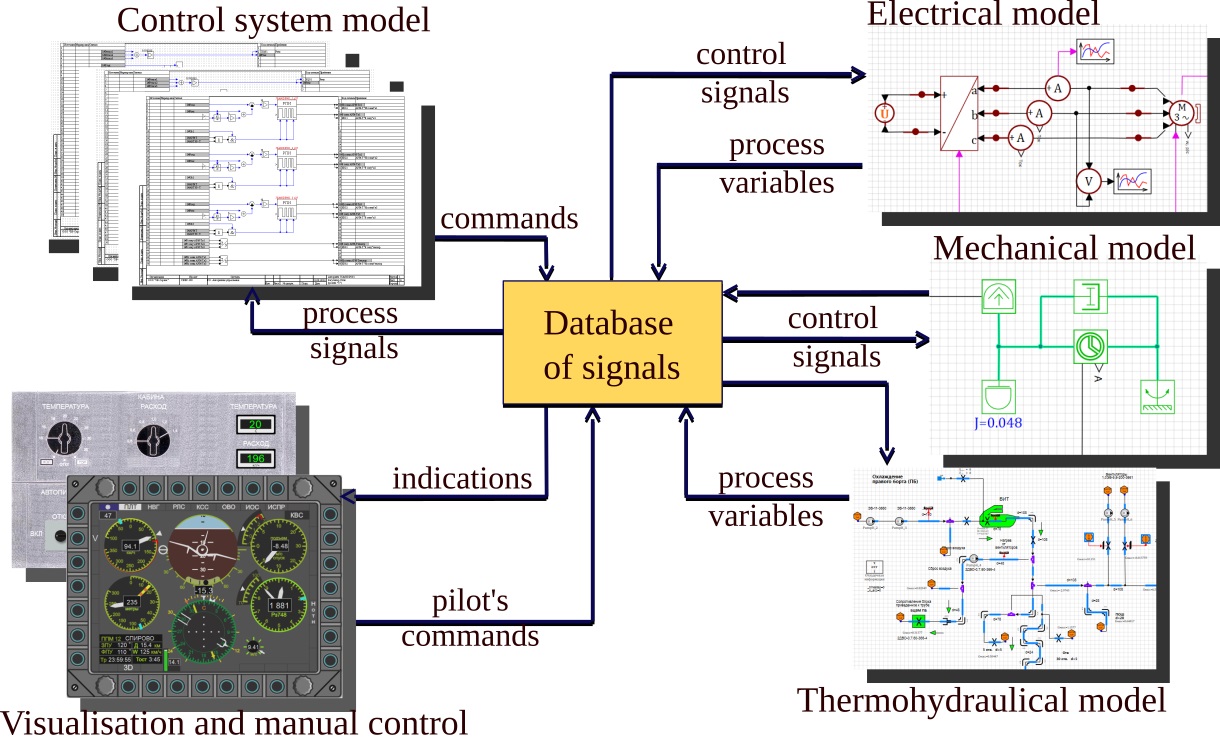 In the domestic simulation modeling complex SimInTech, a broker is not used: the model does not register signals, but simply takes them by requests to the common intermodel signal database. The architecture of the complex is shown in Fig. 5.