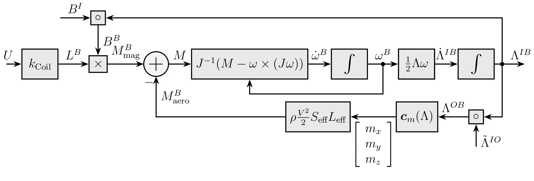 Figure 9 shows the structural diagram of the rotational motion model. It details the EMU, KA and Aerodynamics blocks shown in Fig. 1.