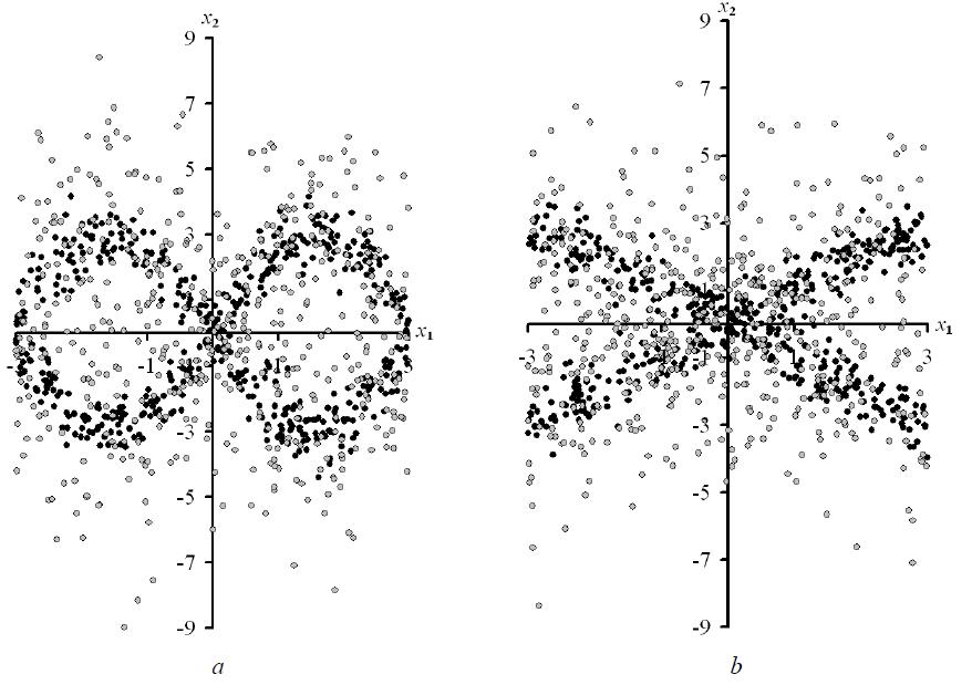 Fig. 1. Values x1, x2 of random variables from a sample of initial statistical data V at n = 500 and σ = 0.5 (dark dots), and at σ = 2 (grey dots) when using dependencies of varying complexity