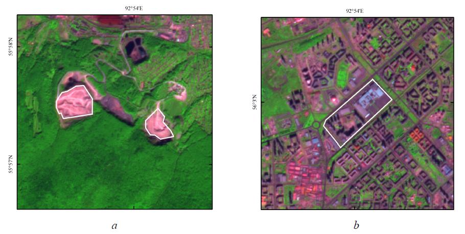 The developed methodology was tested when analysing the remote sensing data [2; 28]. The object of the study is anthropogenic territories (quarry, suburban development) in the vicinity of the city of Krasnoyarsk. The initial information was formed on the fragments of Sentinel-2 satellite imagery on 26.08.2021 (Fig. 2). The spectral channels , were used. These channels are characterised by wavelengths (nanometres): (458523), (543578), (650680), (698713), (733748), (773793), (785899), (15651655), (21002280).