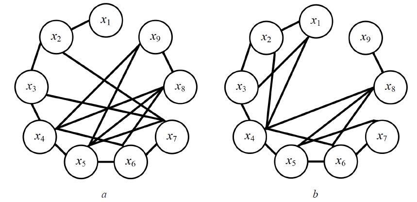 - Based on the results of step 1, construct an information graph , where is a set of its vertices corresponding to the components of the random variable , and is a set of edges. Between the two vertices , there is an edge if the hypothesis is satisfied, i.e. the components , are independent.