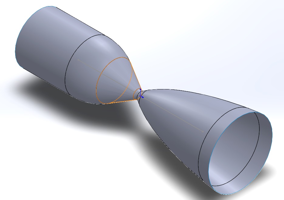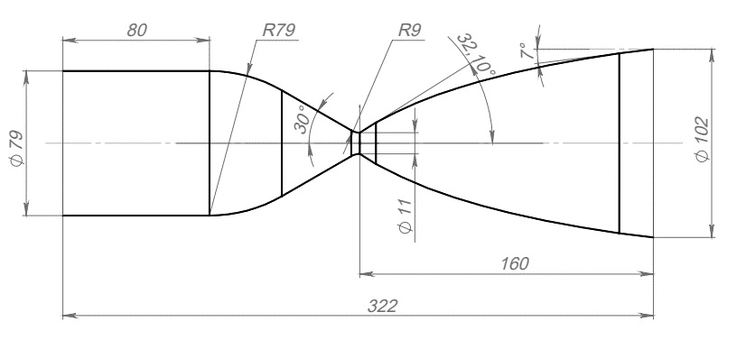 As part of the modernization of the test rig for fire tests of low-thrust liquid rocket engines (LRELT), designed to operate on liquid kerosene and gaseous methane, a series of thermodynamic calculations of the engine chamber were carried out. The purpose of these calculations was to determine the geometric parameters of the actual ratio of fuel components and their mass flow rate, as well as the temperatures of combustion products and specific impulse. The thermodynamic calculation was carried out using the methodology [6; 7], the initial data for performing the calculation and the main results obtained are presented in Table 1. The gas-dynamic contour and three-dimensional model of the engine chamber obtained during the calculation are shown in Figs. 1 and 2.