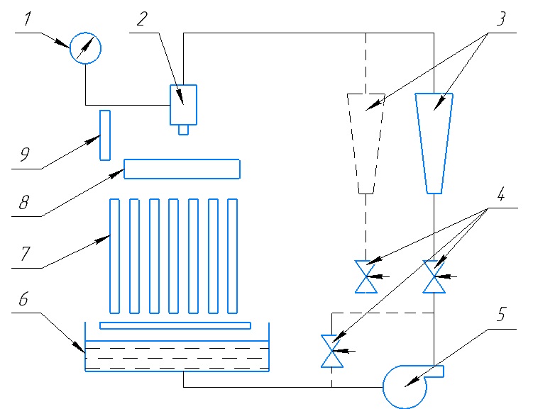 1 pressure gauge; 2 nozzle; 3 rotameter; 4 valve; 5 pump; 6 water tank; 7 glass tubes; 8 nozzles for removing sprayed water along a radius or circle; 9 device for measuring the angle of the spray torch