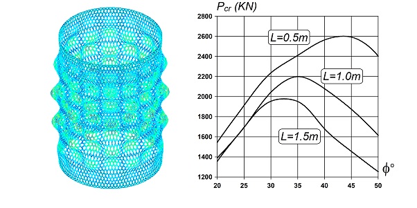 Рис. 6. Форма потери устойчивости цилиндрической сетчатой оболочки при осевом сжатии и графики зависимости критического усилия (Pcr) от величины углов намотки спиральных ребер (ϕ°) для моделей различной длины (L)