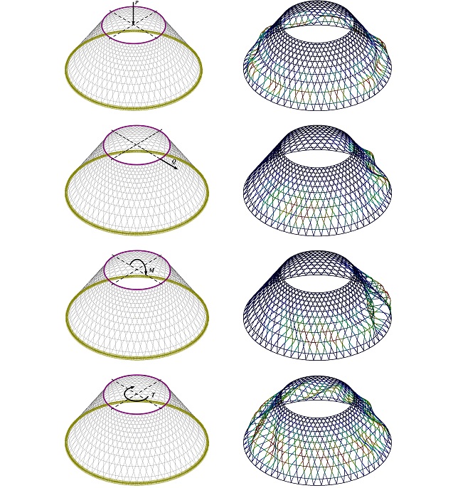 Рис. 7. Расчетные схемы (слева) и формы потери устойчивости (справа) в анализе устойчивости сетчатой конической оболочки с вариантами торцевой нагрузки на малом основании и закрепленным большим основанием