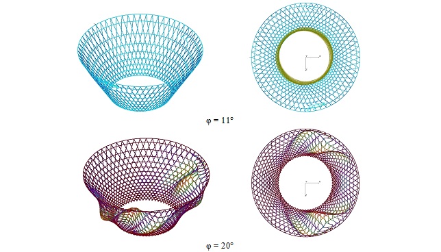 The following modal study was conducted for an anisogrid conical shell with a fixed small base and a specified load of 5225 kg on the free (large) base. As before, the shell rigidity and load-bearing capacity under axial overload were investigated. The behavior of the obtained parameters: frequencies of natural vibrations of various types (see Fig. 9) and critical values of axial overload (Table 5) are influenced by the mutually inverse tendencies of change in longitudinal and bending rigidity: as the approach angle φ increases, the bending rigidity increases, and the longitudinal rigidity decreases. In the general case, an increase in the approach angle φ is also advisable for increasing the critical force from axial overload, which for two model variants (φ = 11° and φ = 23°) differs by 4 times.