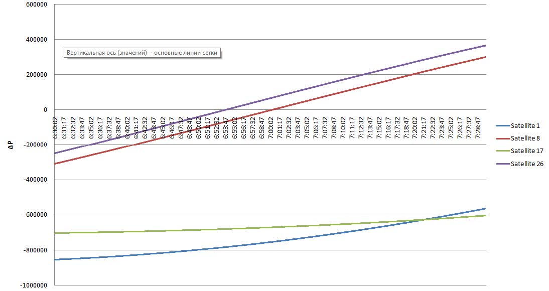 The essence of the hypothesis is this: since the satellites move in orbits with a large radius, it can be assumed that over a short period of time the change in distance from each satellite to the observer will have a linear law. This means that when the distance to one satellite changes, it is possible to predict the amount of change in the distance to another satellite. To confirm this hypothesis, ΔP graphs were constructed for various satellites (Fig. 1).