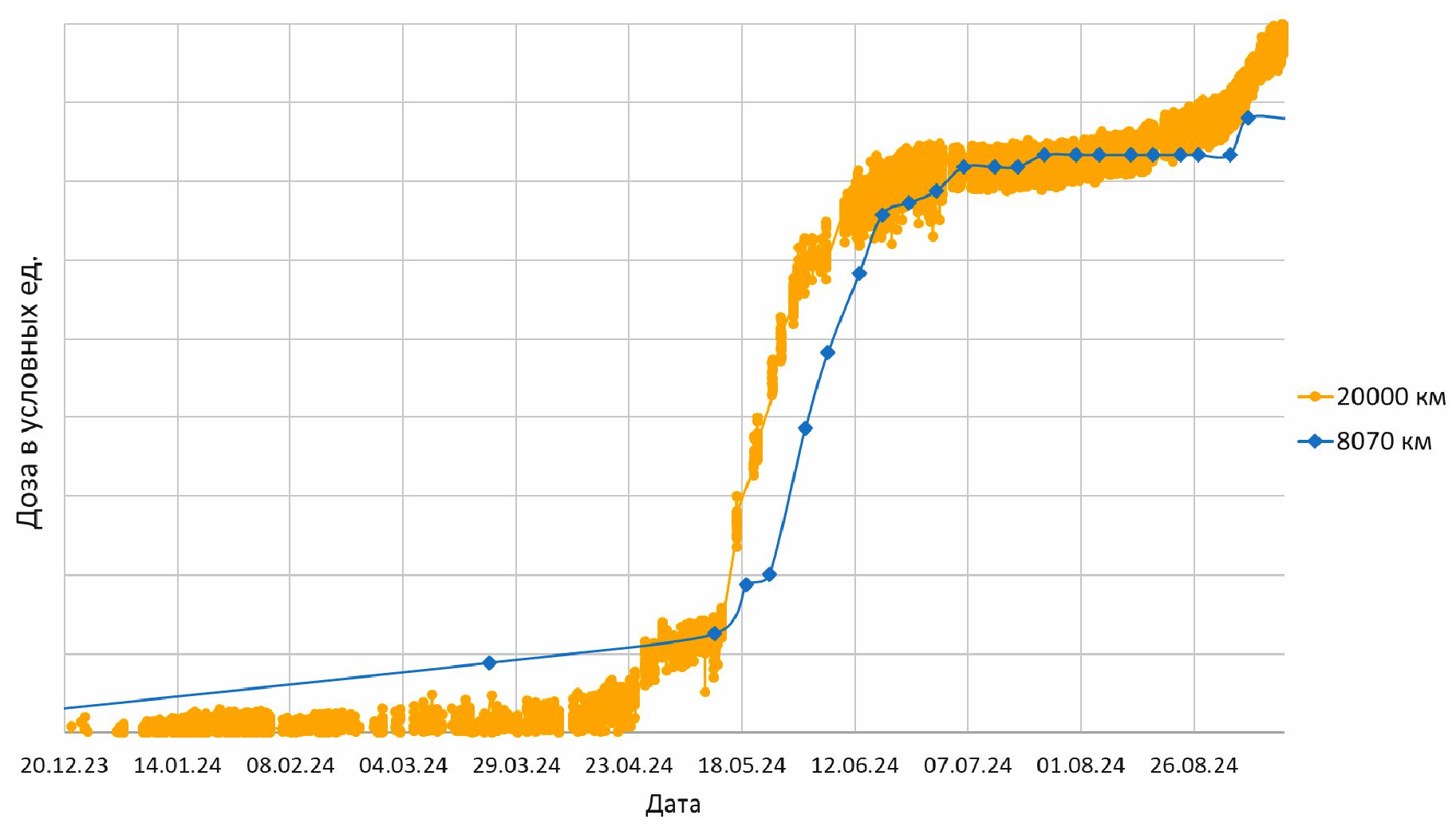 As evident from the graphs, at 20.000 km the dose accumulation rate sharply increases immediately after the storm, whereas at 8.070 km the increase in rate begins approximately 11 days later. This behavior can be explained by a gradual displacement of the radiation belt followed by stabilization of the Earth's magnetic field intensity and restoration of the radiation belt position to its pre-storm level.