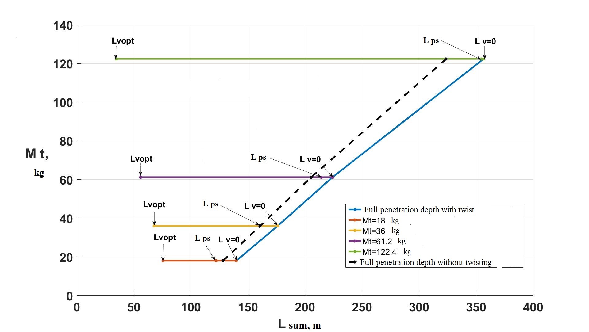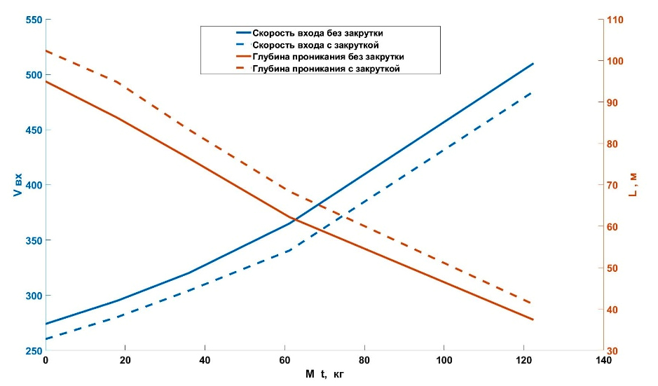 Table 1. Results of calculations of depths of penetration of the SPART into loam with rotation, depending on the mass of fuel used