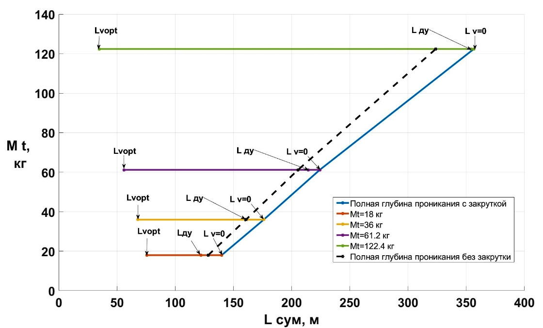 Рис. 2. Зависимость полной глубины проникания СПАРТ от массы топлива РДТТ