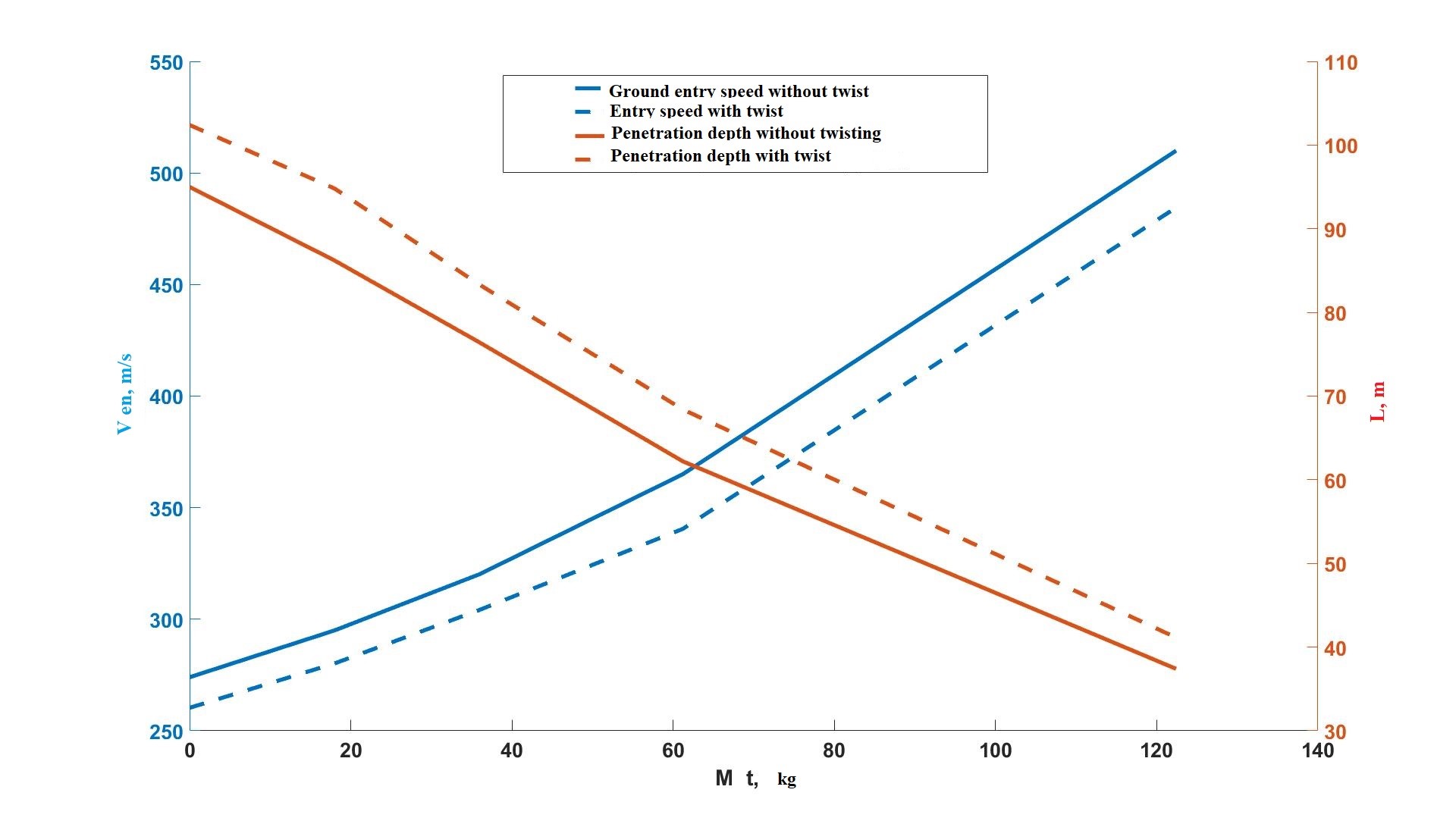 Рис. 1. Зависимости скорости входа и глубины проникания в грунт от массы используемого топлива