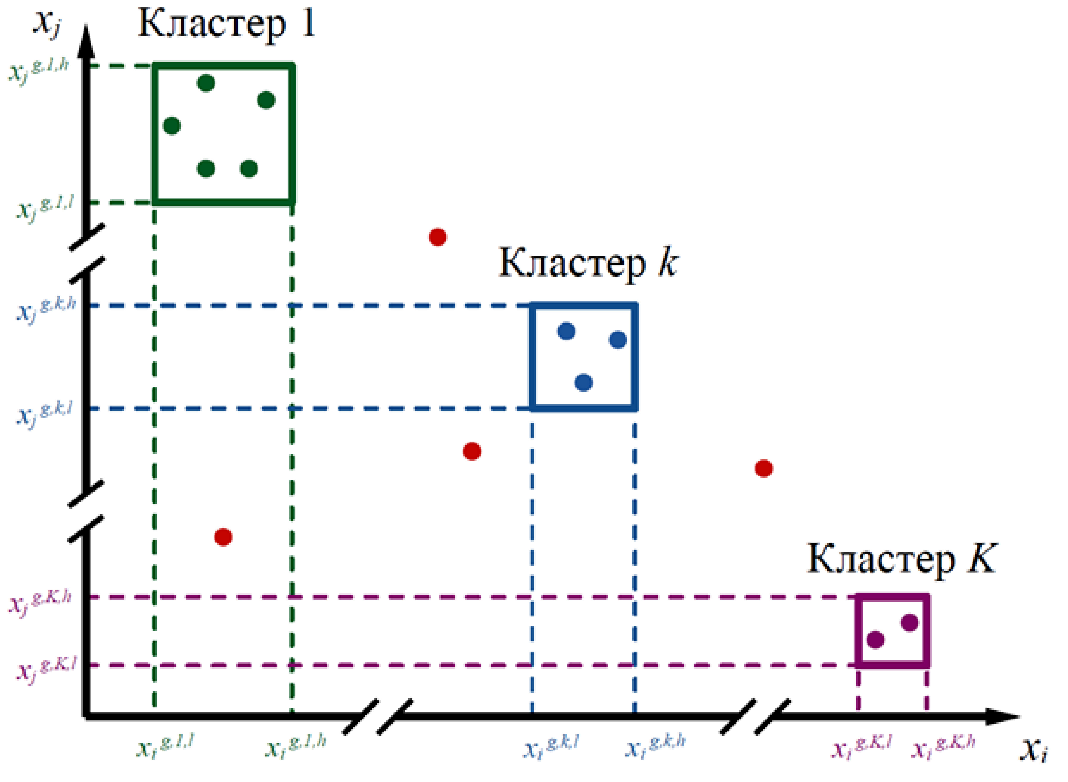 where and are corrective values, based on which the initial boundaries can be either expanded or narrowed. They can be obtained based on the standard deviation of the values of the xi variable within the cluster.