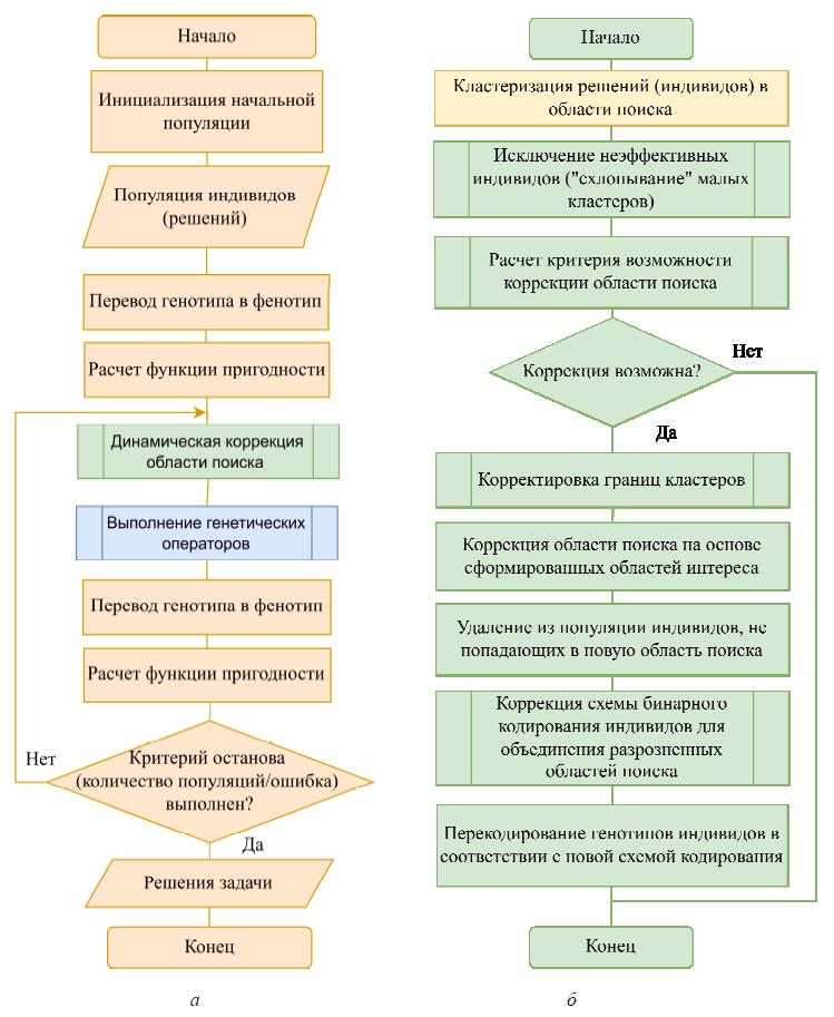 Рис. 2. Блок-схема: а – ГА с динамической коррекцией области поиска; b – процедуры динамической коррекции