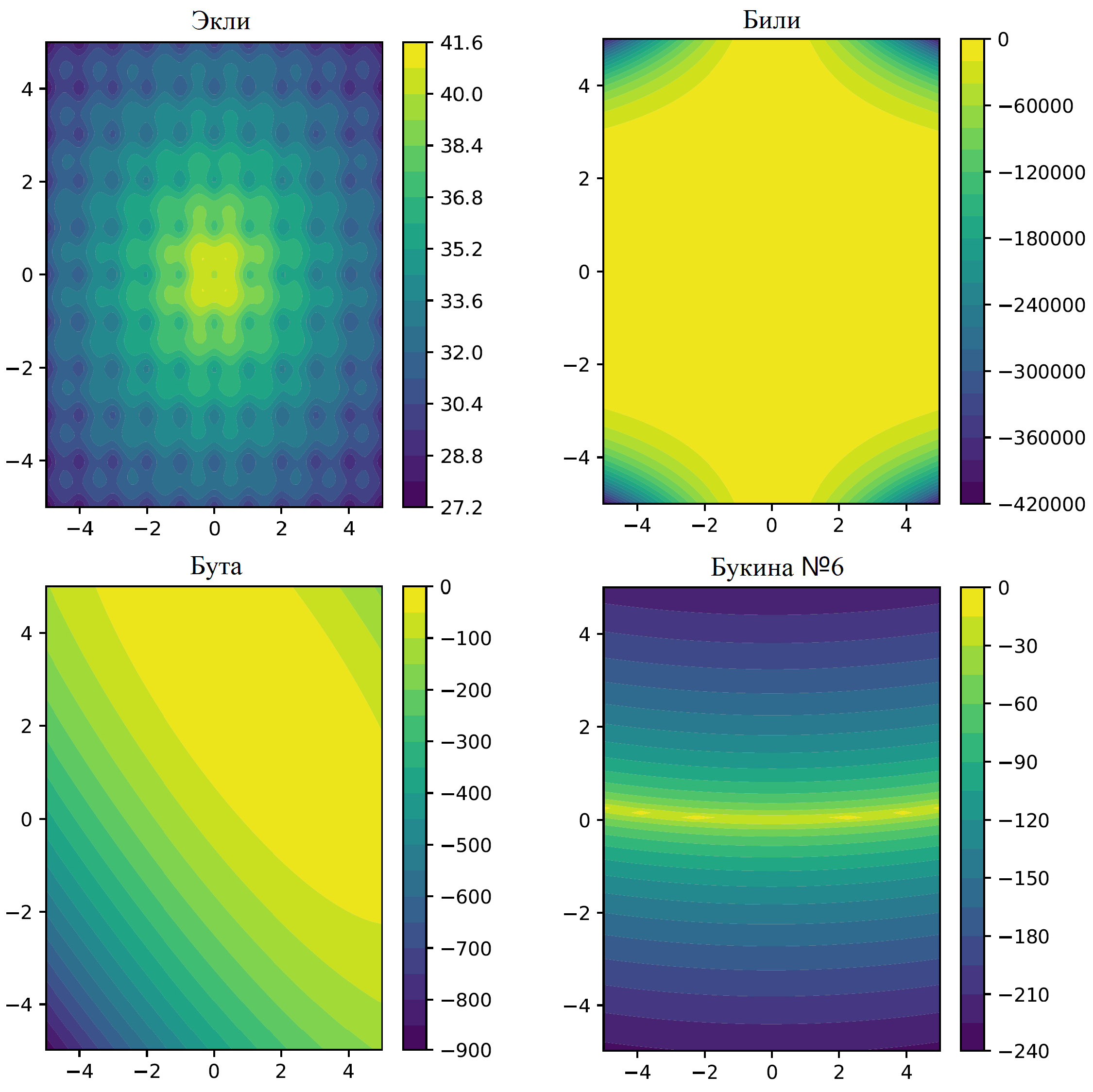 Thanks to the presence of gaps and characteristic ‘ravines,’ the Bukin № 6 function allows evaluating the stability of algorithms to extreme changes in gradient (11):