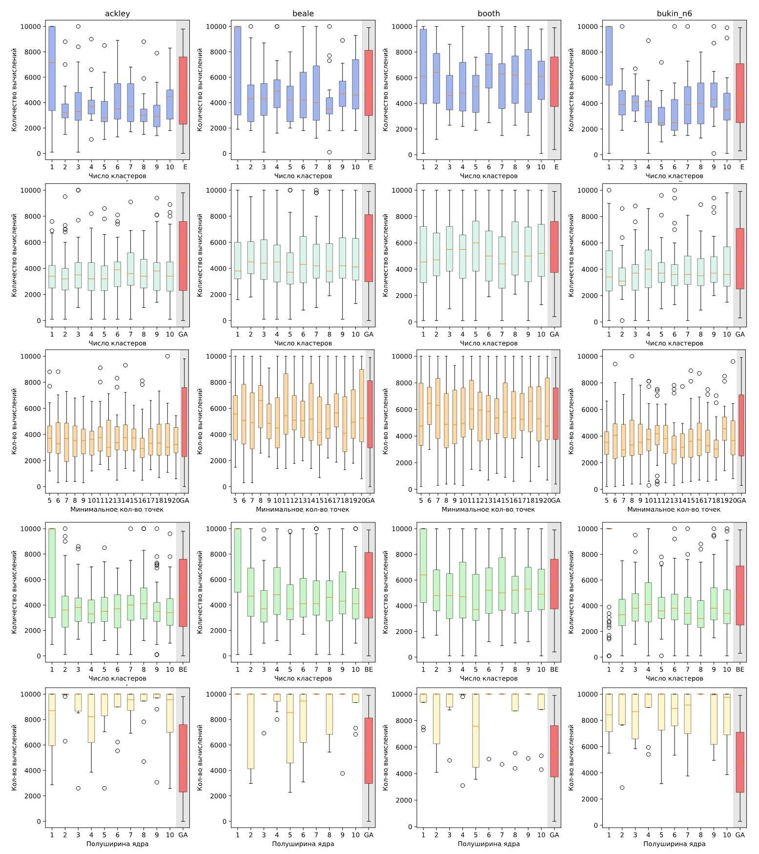 It can be seen from Fig. 4 that for the complex multidimensional functions (Ackley, Beale), the best results are achieved when using 3–6 clusters, where the median values of the number of iterations are lower and the spread is smaller. For the two-dimensional functions (Booth, Bukin №. 6), the influence of the parameter is minimal, thus 1–2 clusters are sufficient without any noticeable loss of quality.